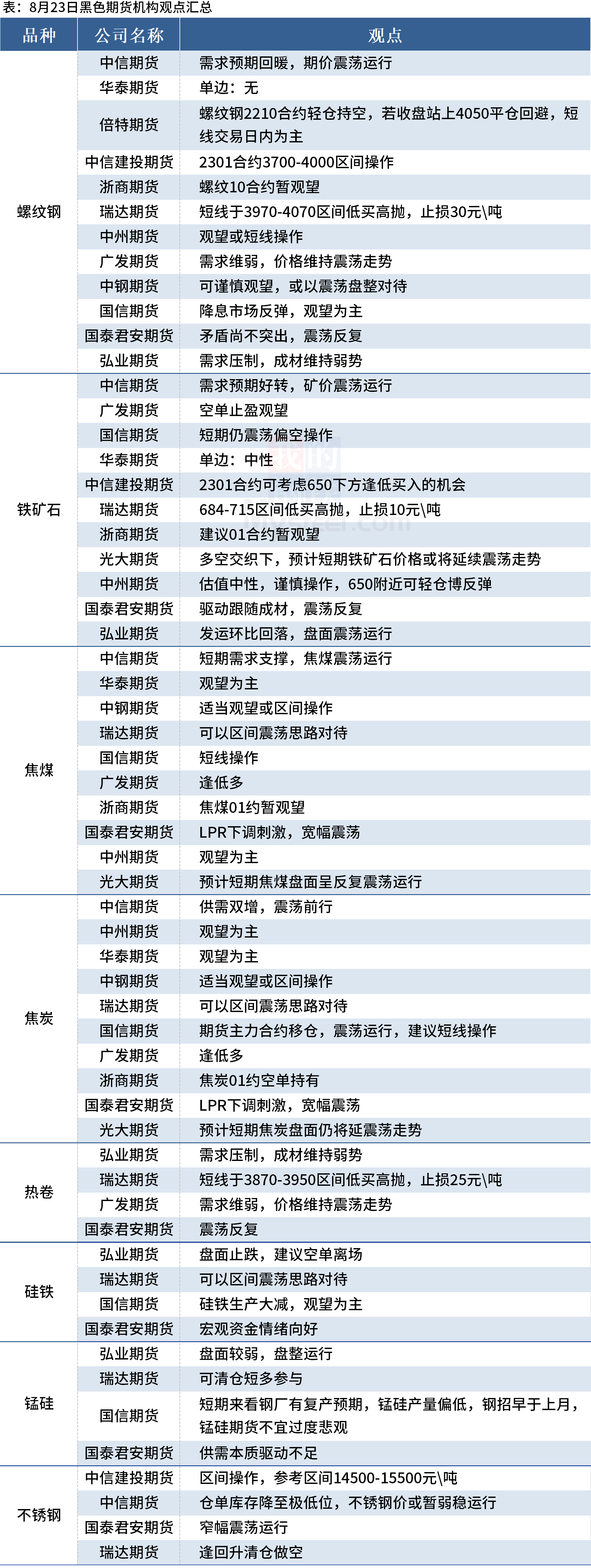 據(jù)Mysteel統(tǒng)計8月23日13家期貨機(jī)構(gòu)操作策略,其中多數(shù)機(jī)構(gòu)料螺紋鋼震蕩運(yùn)行,建議鐵礦石震蕩運(yùn)行,焦煤、焦炭暫觀望。具體匯總內(nèi)容如下: