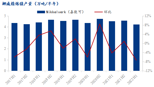 嘉能可在挪威的鎳冶煉廠Nikkelverk是西歐zui大的精煉鎳生產工廠,其原料來自嘉能可在加拿大的鎳礦和第三方供應,Nikkelverk主要產品為鎳板/鎳角,亦有鎳珠、鎳餅等。上半年工廠生產精煉鎳4.24萬噸,環(huán)比減少7.42%,同比減少6.61%。