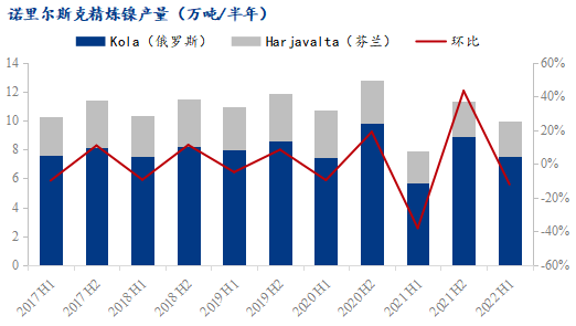 2021年一季度,諾里爾斯克鎳業(yè)位于北極區(qū)域的Oktyabrsky 和Taimyrsky兩座礦山因地下水滲入而暫停運營,維修至5月開始逐漸恢復生產,至11月完全恢復產能。該兩座礦山提供了諾里爾斯克鎳業(yè)在俄羅斯和芬蘭工廠的約50%礦石原料,其停產對企業(yè)的原料供給影響巨大,2021全年產量較2020年下降了18.12%。故在產能得到恢復后,2022上半年產量同比有了較大增漲。