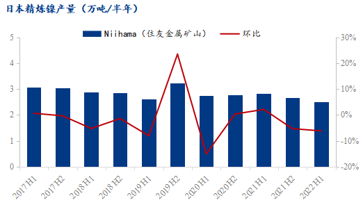 住友金屬礦山株式會社在日本新居濱(Niihama)的工廠2022上半年生產2.51萬噸鎳板,環(huán)比減少6.16%,同比減少11.13%。上半年主要由于原料供應問題與設備檢修,Niihama工廠產量有所減少。