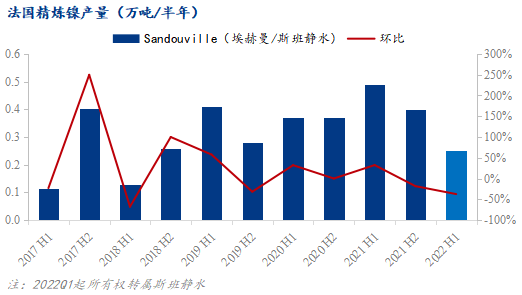 法國的精煉鎳工廠為坐落于諾曼底大區(qū)的Sandouville工廠,原屬法國埃赫曼鎳業(yè)集團(Eramet),2022年2月被出售給了南非企業(yè)斯班靜水(Sibanye-Stillwater)。上半年多數(shù)時間工廠仍在整合期,產量大幅下降至約0.25萬噸(預估),環(huán)比減少37.50%,同比減少48.98%。