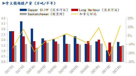 英美資源公司的RPM工廠主要產品為鎳板,2022上半年產量為1.08萬噸,環(huán)比減少7.69%,同比增加1.89%。