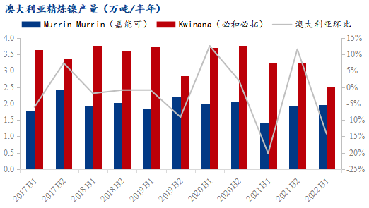 澳大利亞的精煉鎳產能主要來自嘉能可在西澳大利亞的Murrin Murrin工廠和必和必拓公司(BHP)在西澳大利亞的Kwinana工廠,二者的主要產品都為鎳豆和鎳粉。