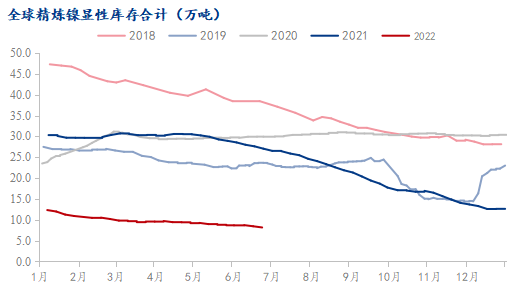 截至Mysteel6月24日統(tǒng)計全球鎳顯性庫存(中國庫存+LME鎳庫存)8.16萬噸,較2021年底減少4.28萬噸,降幅34.40%。其中鎳板減少0.99萬噸,中國去庫占約2/3;鎳豆減少3.24萬噸,絕大多數(shù)來自LME庫;鎳珠去庫0.05萬噸。